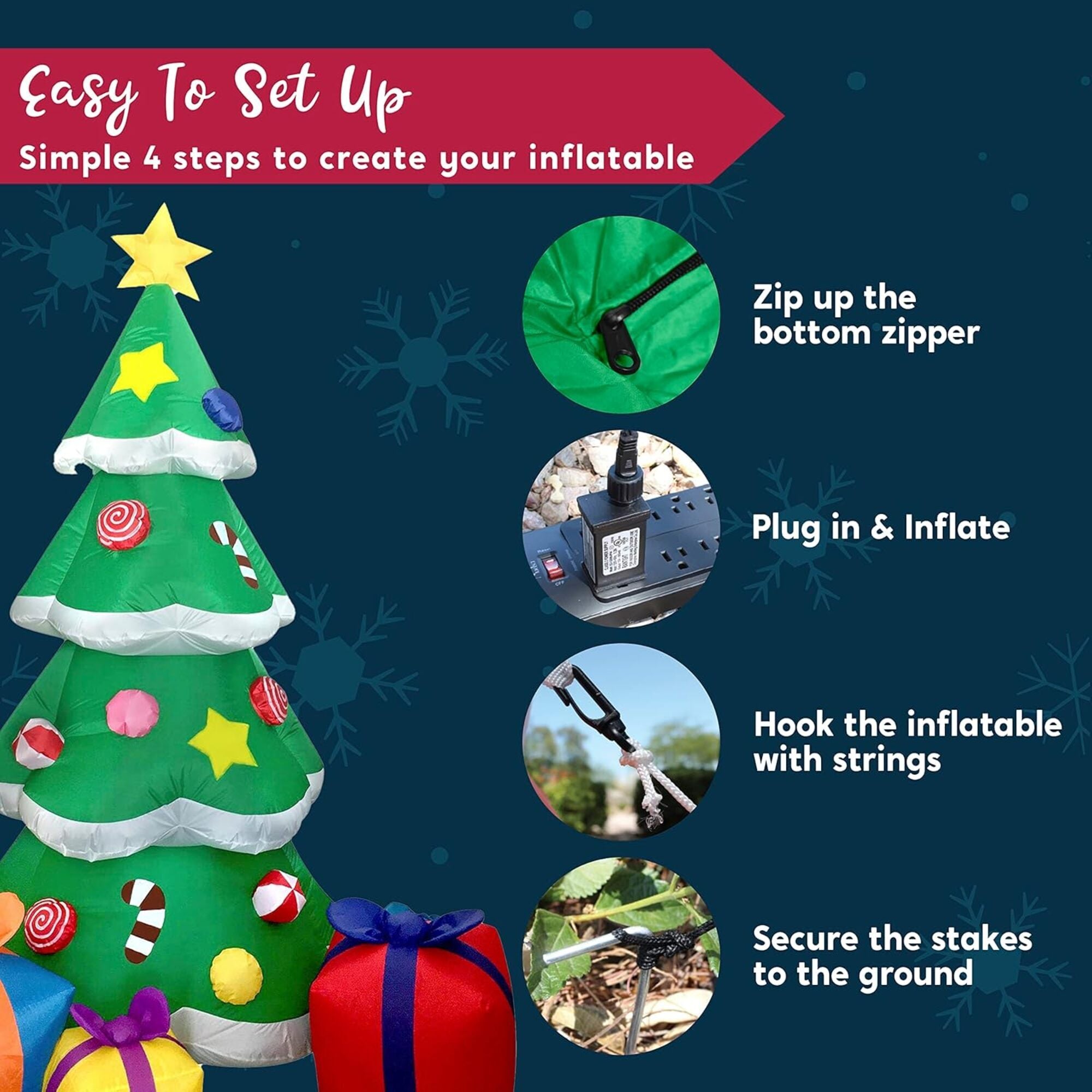 Add a touch of festive magic to your home with this 7 Ft Inflatable Christmas Tree, complete with colorful ornaments, candy canes, a glowing star topper, and three bright gift boxes at the base. Perfect for indoor and outdoor holiday displays, this cheerful decoration features built-in LED lights that create a warm and inviting glow at night. The self-inflating design with an IP44-rated blower makes setup quick and easy—just plug it in and watch it come to life in seconds. Made from durable, waterproof polyester fabric, it is designed to withstand winter weather. With stakes, ropes, and built-in sandbags included, this inflatable stays securely in place, even in windy conditions.