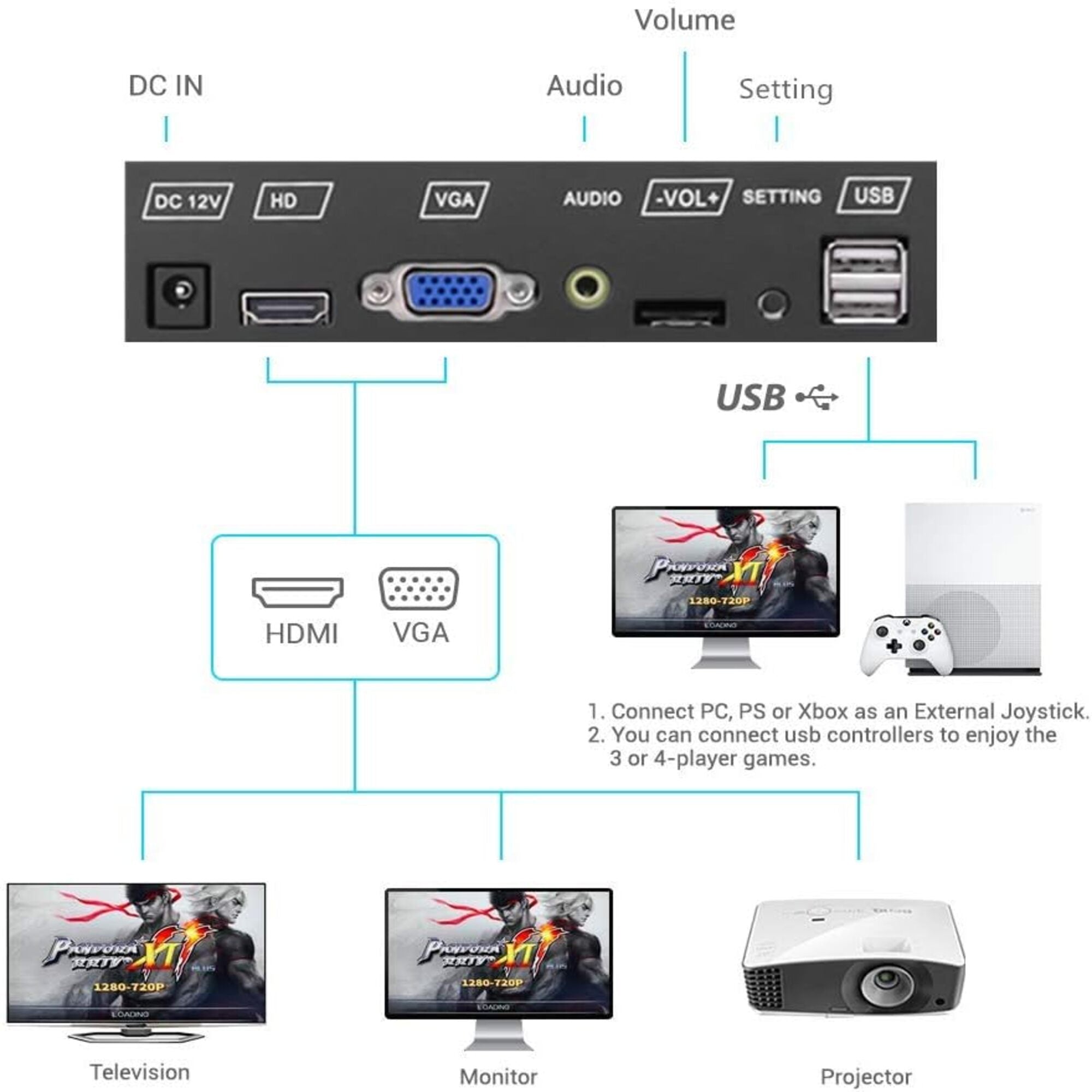 Multiple Connection Options: Easily connect to TVs, monitors, or projectors via HDMI or VGA, or use as an external joystick for PC, PS, or Xbox. USB ports allow additional controllers for 3-4 player games.